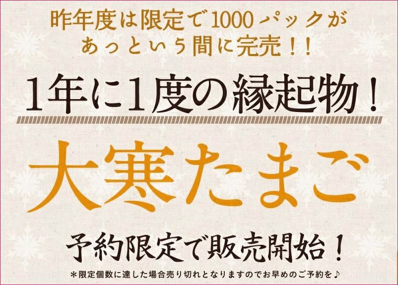 大寒卵は特に販売期間が短く、予約販売のみのブランド商品が多いのでご注意ください。