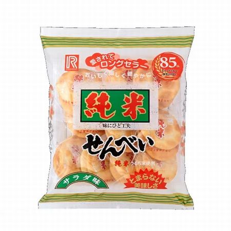 「純米せんべい」は昭和30年代後半、当時まだ高級品であったサラダ油を使用し、ほどよい塩味と、やさしい食感に仕上げたおせんべいです。 当時、おせんべいはしょうゆ味が主流でしたので、油や塩を使用した「純米せんべい」はめずらしく、新しいおせんべいとして大変好評を博しました。 厚めの生地にさっくりとした食感、コクとうまみのある塩味が特徴で、主に北日本を中心に広まり、今や50年以上長く愛されている商品となっております。 原材料名:うるち米(国産、米国産)、植物油脂(大豆を含む)、食塩/調味料(アミノ酸)