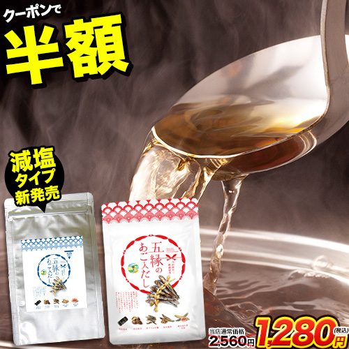 今なら通販で「半額クーポン」を使う事で、「五縁のあご入だし」が大変お得に購入できます!